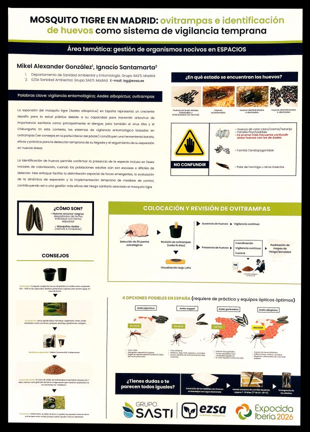 Figura 15. PÓSTER 14 – ‘Mosquito tigre en Madrid: ovitrampas e identificación de huevos como sistema de vigilancia temprana’, por Mikel Alexander GONZÁLEZ & Ignacio SANTAMARTA.