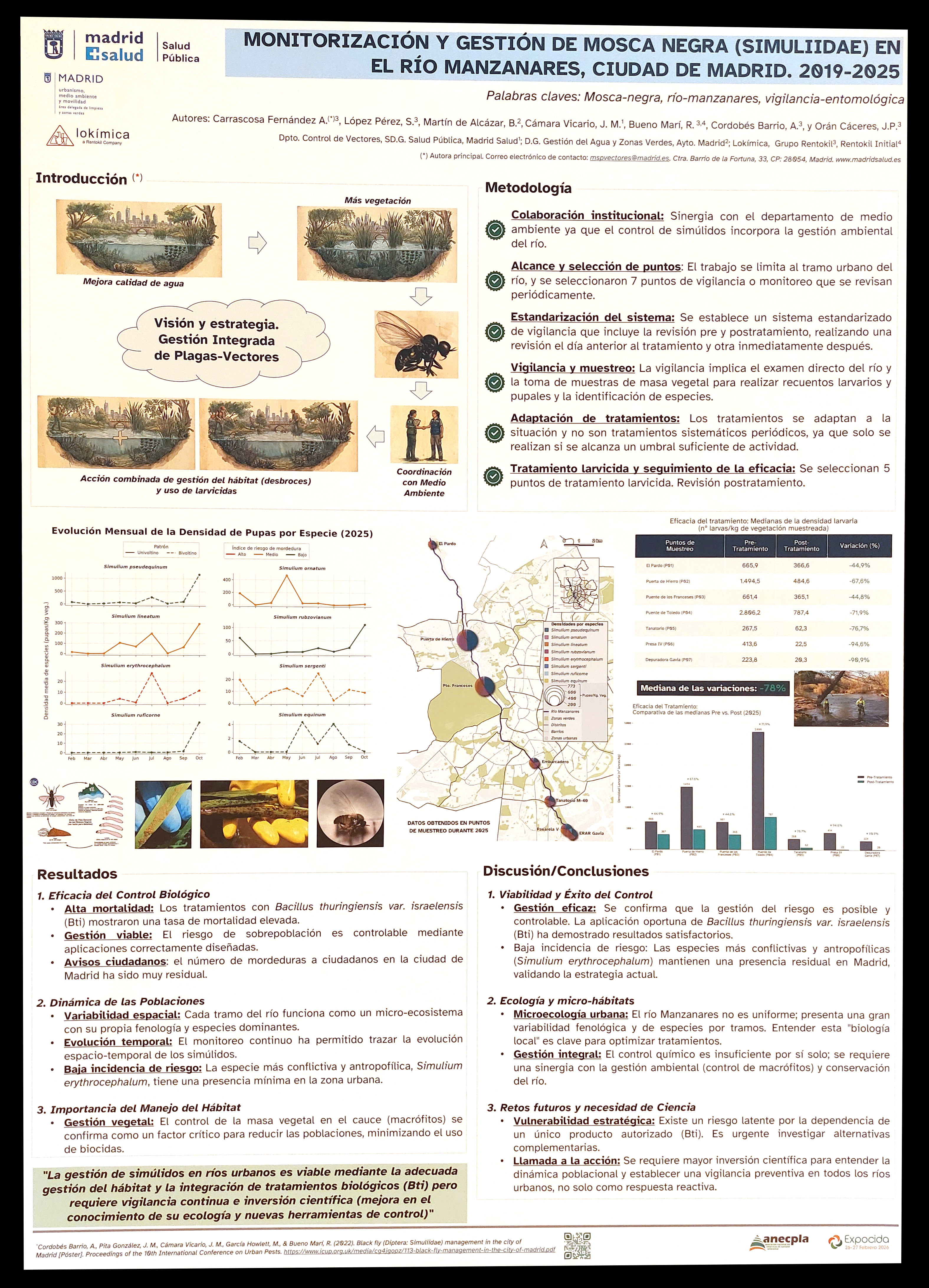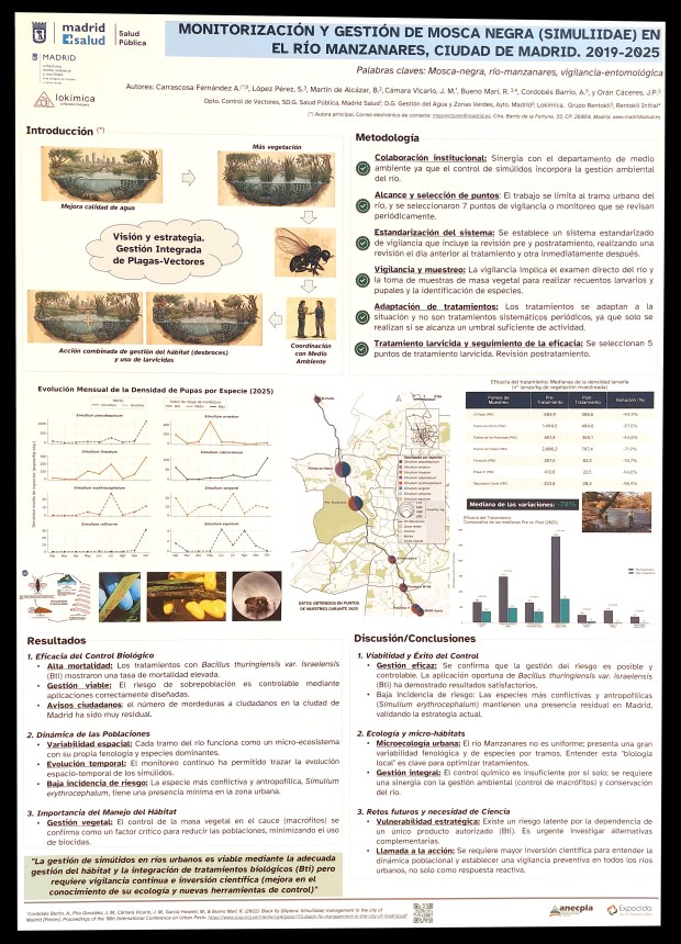 Figura 18. PÓSTER 17 – ‘Monitorización y gestión de mosca negra (Simuliidae) en el río Manzananares, Ciudad de Madrid, 2019-2025’, por A. CARRASCOSA FERNÁNDEZ, S. LÓPEZ PÉREZ, B. MARTÍN DE ALCÁZAR, J.M. BUENO-MARÍ, A. CORDOBÉS-BARRIO & J.P. ORÁN CÁCEERES.