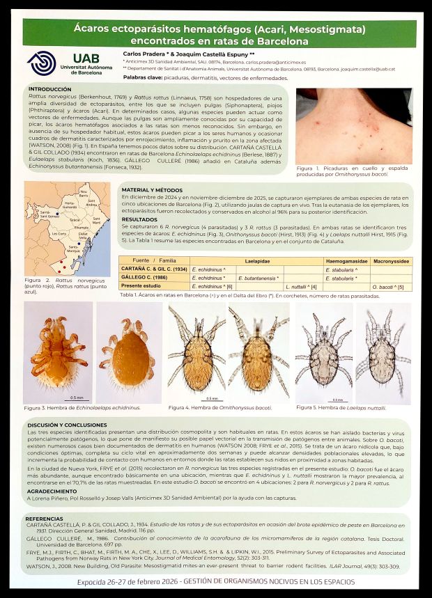 Figura 3. PÓSTER 2 – ‘Ácaros ectoparásitos hematófagos (Acari, Mosostigmata) encontrados en ratas de Barcelona’, por Carlos PRADERA Joaquim CASTELLÁ ESPUNY.