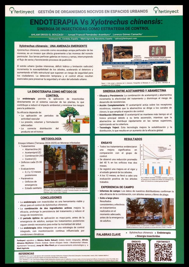 Figura 23. PÓSTER 22 – ‘Endoterapia vs Xylotrechus chinensis: sinergia de insecticidas como estrategia de control’, por Ahlam DRISSI EL BOUZAIDI, Ismael FRANCOLÍ FERNÁNDEZ-ARAMBURU & Lorenzo GÓMEZ CAMACHO.