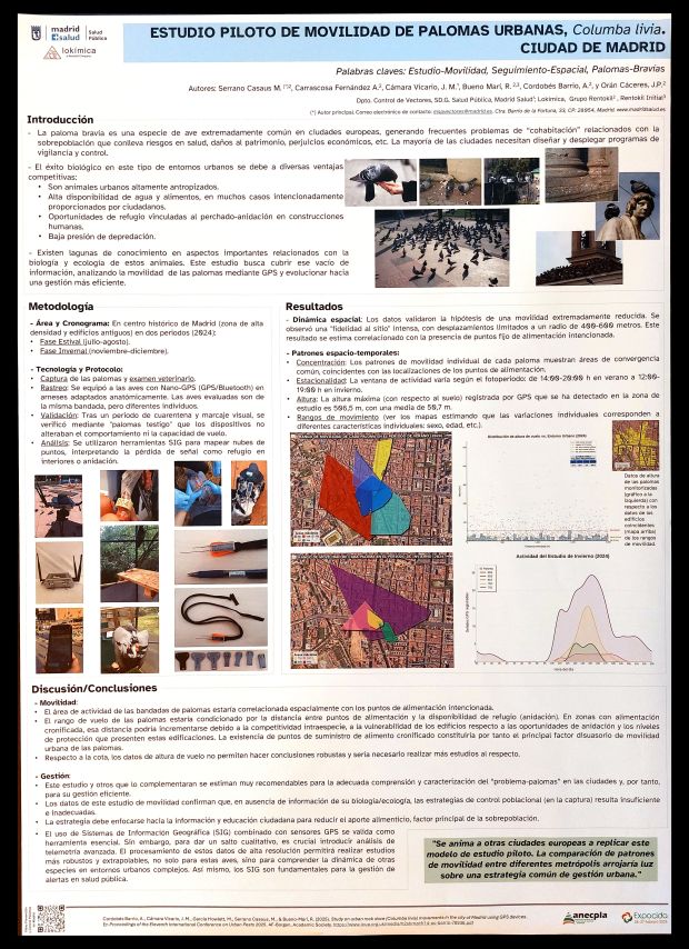 Figura 26. PÓSTER 25 – ‘Estudio piloto de movilidad de palomas urbanas, Columba livia, Ciudad de Madrid’, por M. SERRANO CASAUS, A. CARRASCOSA FERNÁNDEZ, J.M. CÁMARA VICARIO, R. BUENO MARÍ, A. CORDOBÉS BARRIO & J.P. ORÁN CÁCERES.