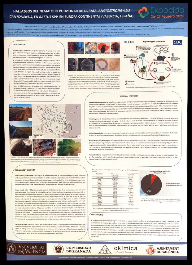 Figura 5. PÓSTER 4 – ‘Hallazgos del nematodo pulmonar de rata, Angiostrongylus cantonensis, en Rattus spp. en Europa continental (Valencia, España)’, por María Teresa GALÁN-PUCHADES, Mercedes GÓMEZ-SAMBÁS, Antonio OSUNA, Sandra SÁEZ-DURÁN, Juan Pablo SERNA MOMPEAN, Isaac A. GARCÍA MASIÁ, Jesús LÓPEZ-FERRER, Rubén BUENO-MARÍ & Màrius V. FUENTES.