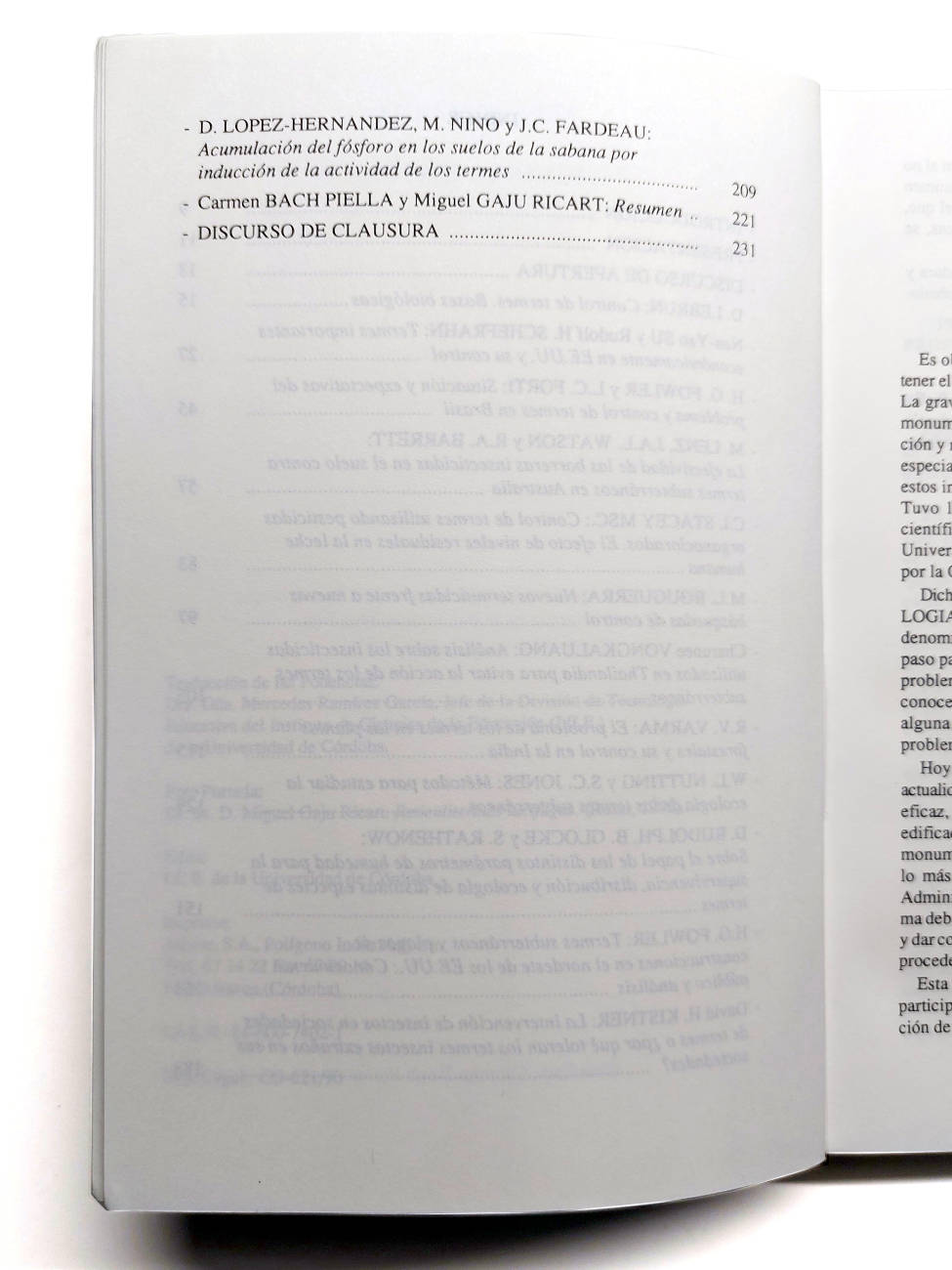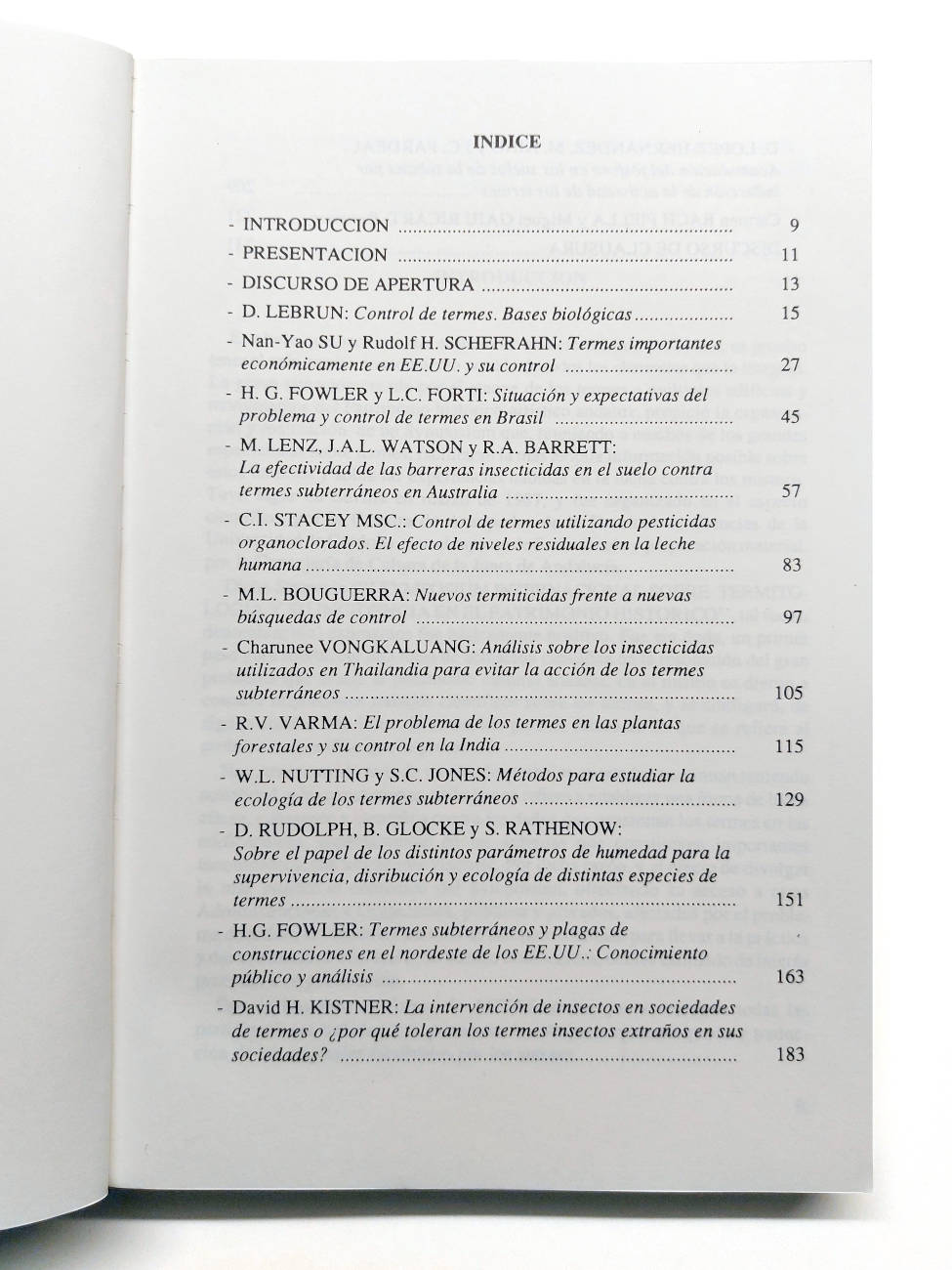 Fue un evento de primer orden. Presentaron ponencias los principales especialistas a nivel mundial en aquel entonces, hace casi tres décadas. En las imágenes 2 y 3, se puede ver el contenido del libro. El hecho de que se celebrase en España fue un reflejo de la importancia de las termitas como destructoras del patrimonio. El clima de la península Ibérica es propicio para la termitas del género Reticulitermes. Y la lucha contra ellas lleva muchas décadas con casos destacados como el del monasterio de El Escorial [1]. Tiene un importante impacto económico que no solo ha generado la investigación en la aplicación de sustancias insecticidas y su persistencia, sino en el desarrollo de métodos de control [2]. En España hemos pasado durante el s. XX de padecer las termitas como algo imposible de eliminar, cambiando elementos estructurales dañados por nuevos, a la posibilidad de prevenir sus daños y erradicar sus colonias. Además de permitir el desarrollo de un sector de profesionales dedicados a la protección de la madera, ha permitido el desarrollo de investigadores. En este punto hay que destacar a Miguel Gaju y de la Universidad de Córdoba, que ha promovido la investigación de la biología y control de termitas.