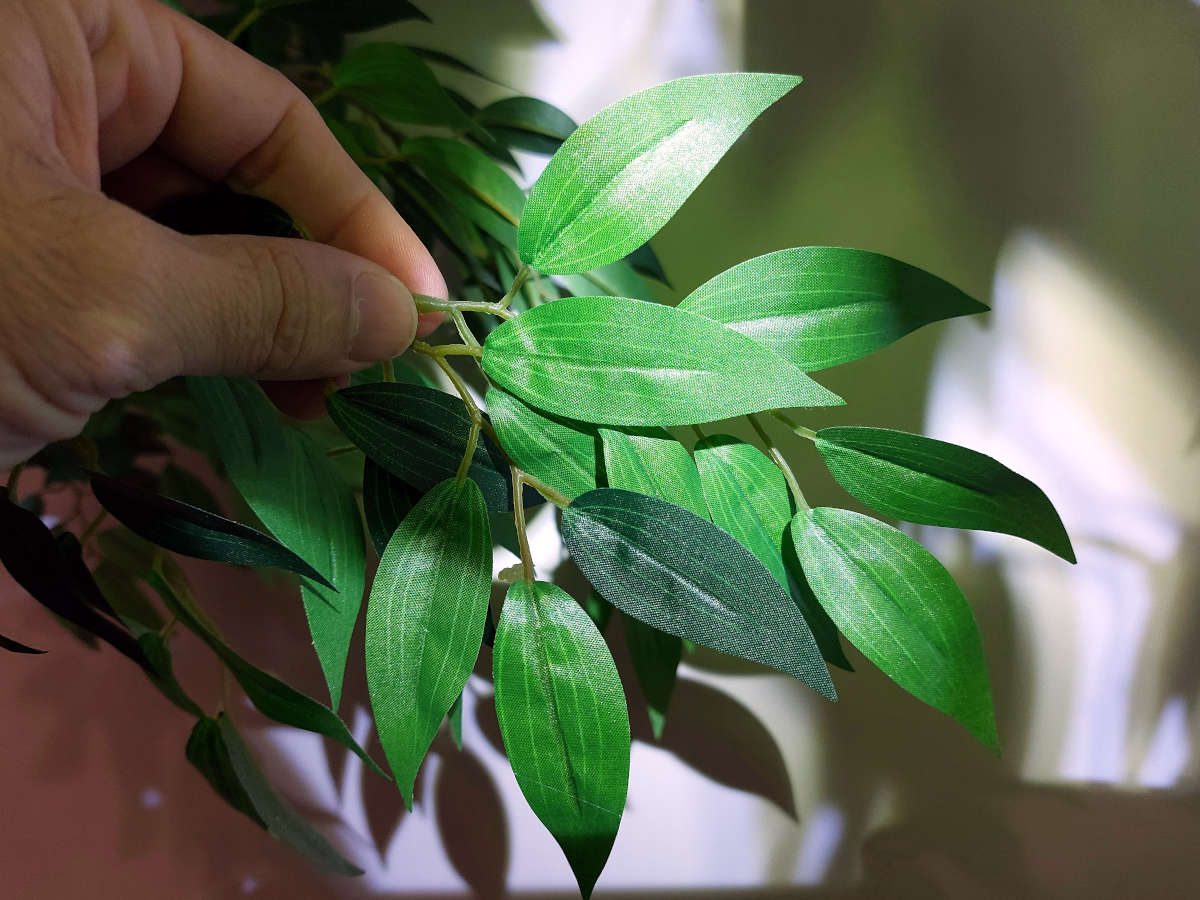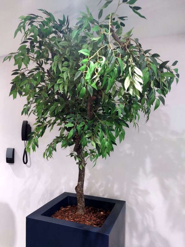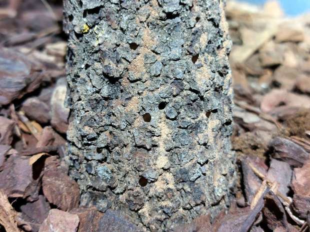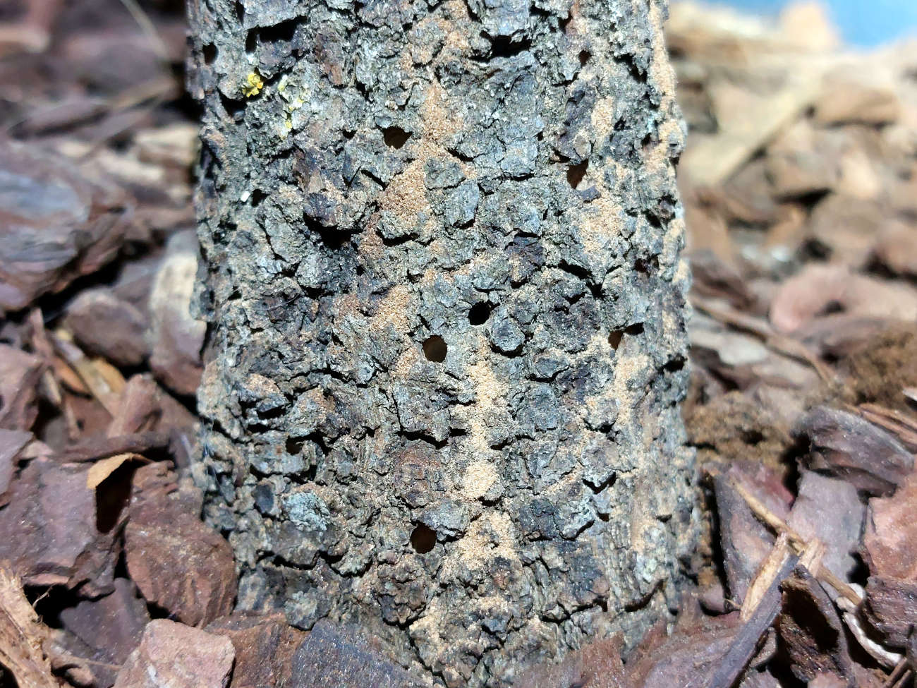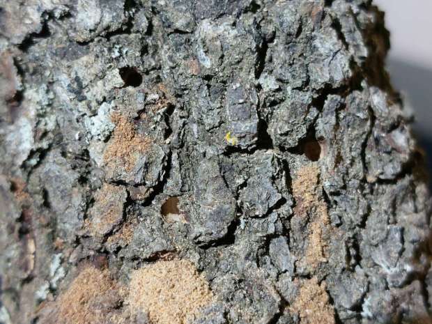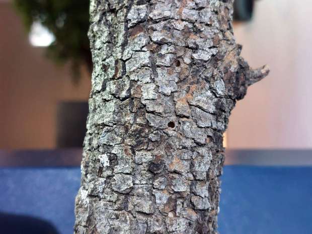 Entonces hemos empezado a buscar madera que pudiera ser el origen. Pero en la sala no hemos encontrado nada después de unos minutos de búsqueda. Ahora bien, la sala no tenía puerta y daba a un pasillo. Entonces hemos buscado allí y hemos visto dos árboles decorativos como el que se puede ver en la imagen número 4. Los árboles estaban formados por una rama de encina y hojas de plástico enganchadas con pegamento (figura 5). El conjunto era triste, a mi parecer. No soy partidario de plantas de plástico. Más que alegrar, me entristecen. Rápidamente, nos hemos dado cuenta de que sería el origen. Al acercarnos, hemos visto los agujeros de salida en el tronco (figuras 6 a 10). Había muchos agujeros con serrín acumulado debajo.