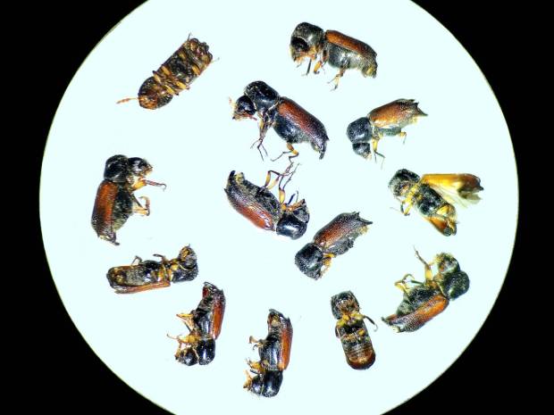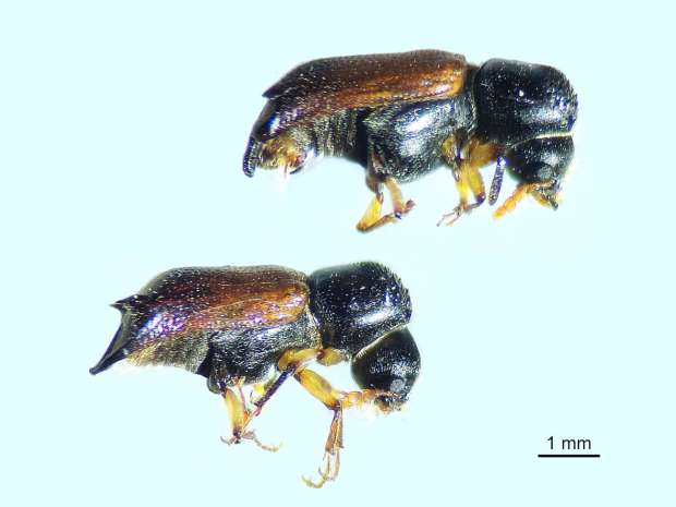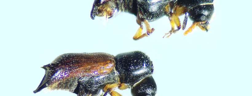 Fig 1. Adultos de Xylopertha praeusta en vista lateral, hembra (parte superior) y macho (parte inferior)./ C. Pradera 04-2026
