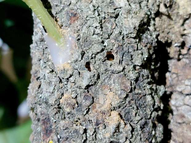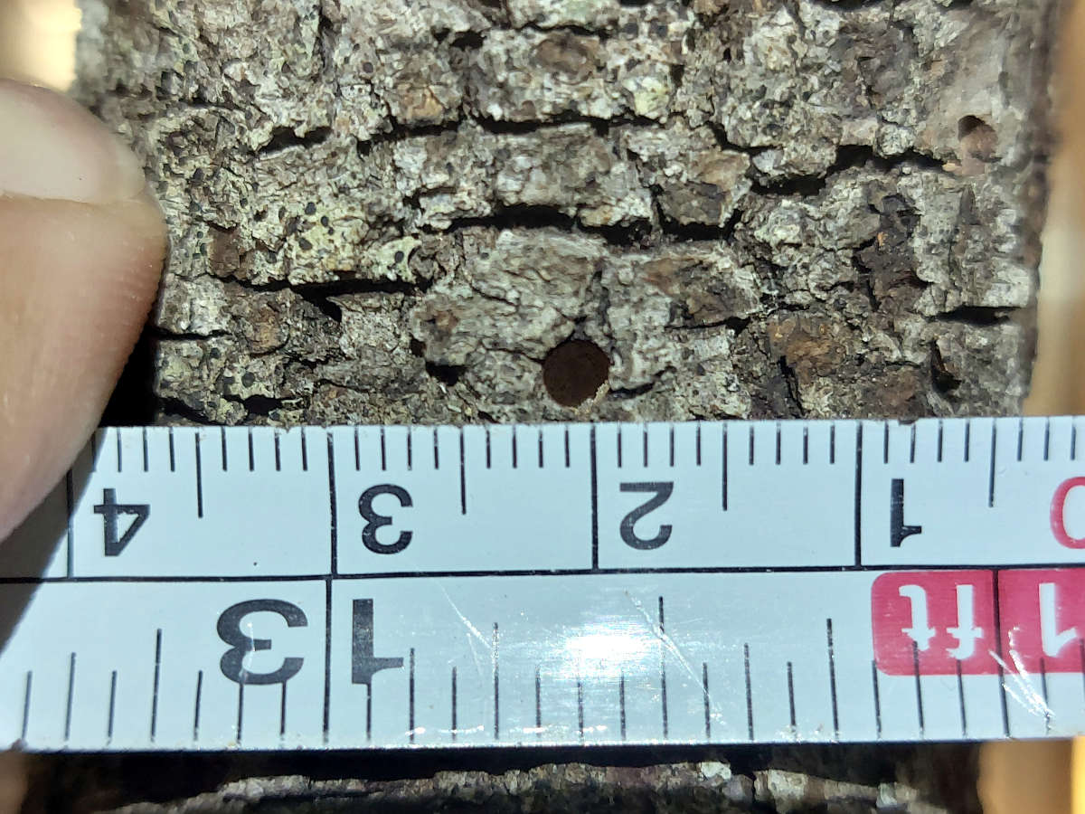 Respecto a esta especie, en el artículo de 2017 de Yiu y Beaver aparecen muchos datos de interés, además de la descripción de los adultos para su identificación [1]. Lo primero que salta a la vista es que hay dimorfismo sexual, identificándose fácilmente ambos géneros (figura 1). Además, hay una importante variación en tamaño (4-8 mm de lontigud), siendo las hembras de mayor tamaño que los machos. En la imagen número 8, se puede ver el tamaño de un agujero de salida con un diámetro de 2-3 mm.