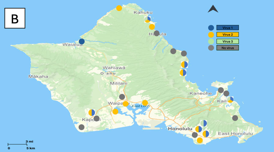Fig 1. Distribución de virus de Pheidole megacephala (Picornavirales) encontrados en la isla de Oahu por Joey Yin-Xin Chang (2025) [7].