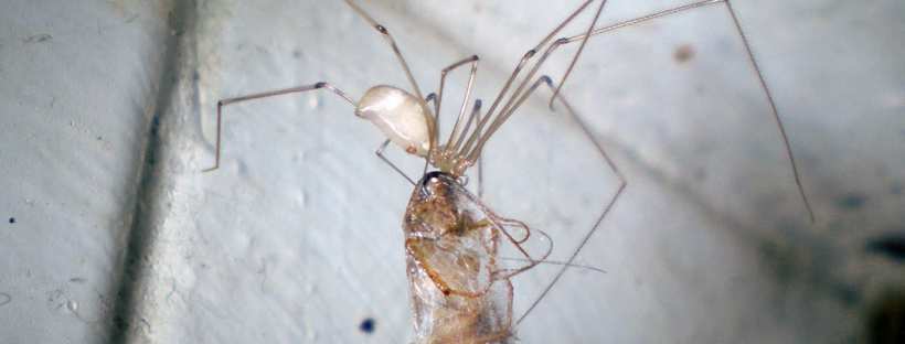 C. Pradera, Barcelona, 02-02-2013 El pasado jueves me encontré en el local de un cliente una bonita escena. Una araña de patas largas de sótano (Pholcus phalangioides) [1] había atrapado una cucaracha germánica (Blattella germanica). Había acabado de arrollarla con su hilo de seda. El local es un restaurante situado cerca de la Plaza Cataluña … Sigue leyendo Cucaracha germánica (Blattella germanica) atrapada por araña de patas largas de sótano (Pholcus phalangioides)