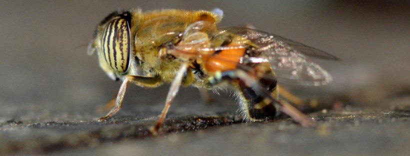 Una hembra de Eristalinus taeniops (Diptera, Syrphidae) ovipositando