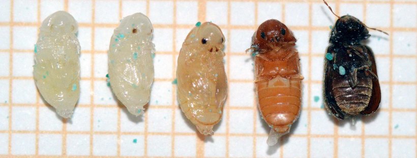 Carcoma del pan, Stegobium paniceum (Coleoptera, Anobiidae), en un bloque de Notrac Blox
