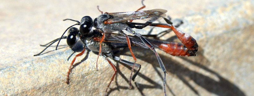 C. Pradera, Barcelona, 07-08-2016 En verano son abundantes las avispas solitarias de la familia de los esfécidos (Sphecidae). Con la llegada del calor se las puede ver atareadas cazando y construyendo las celdas donde se desarrollarán sus crías. En zonas urbanas, son fáciles de ver las del género Sceliphron que construyen celdas de barro en … Sigue leyendo Avispa de la arena Ammophila (Hymenoptera, Sphecidae)