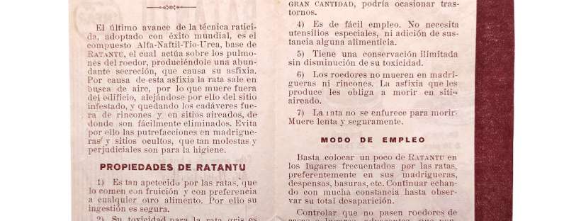 Carlos Pradera, Barcelona, 24-12-2021 Tenía constancia de que en España se había utilizado la alfanaftiltiourea (ANTU) como materia activa rodenticida. Pero desconocía qué productos comerciales había disponibles. Y también hasta cuándo fue utilizada. Ha sido una suerte descubrir el díptico publicitario de RATANTU, un producto comercial preparado por la compañía Industrial Farmacéutica de Zaragoza SA … Sigue leyendo RATANTU de Industrial Farmacéutica de Zaragoza y el uso del ANTU en España.