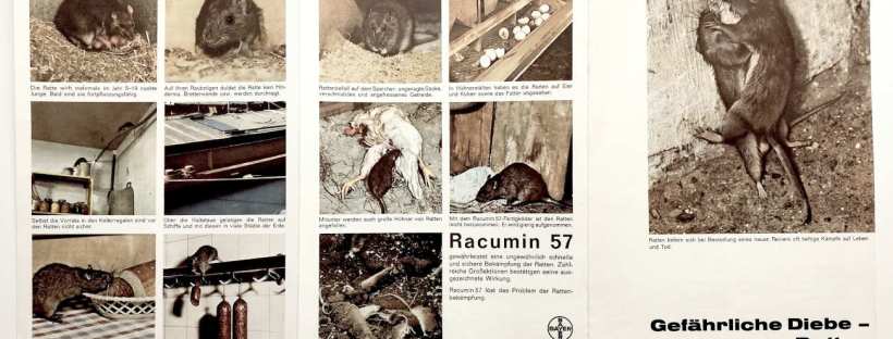 Carlos Pradera, Barcelona, 01-11-2020 He conseguido un tríptico publicitario en alemán de Racumin 57 de Bayer AG titulado 'Gefährliche Diebe-Ratten' (ratas ladronas peligrosas). Se trata de una publicación dirigida al público en general para mostrar la necesidad de usar Racumin 57 para controlar las ratas. El anverso del tríptico es a color (figura 1) y, … Sigue leyendo ‘Gefährliche Diebe-Ratten’, tríptico publicitario de Racumin 57 (1960s)