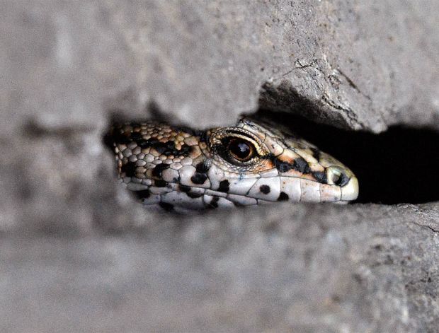 Fig 127. Lagartija Podarcis escondida en una pared de piedra./ C. Pradera 2014