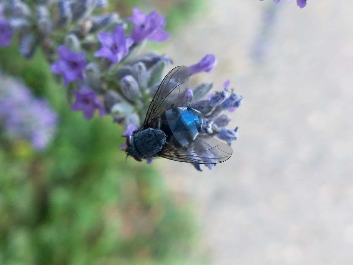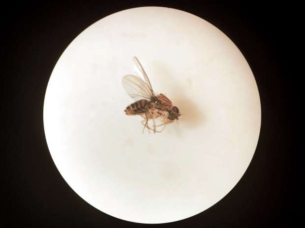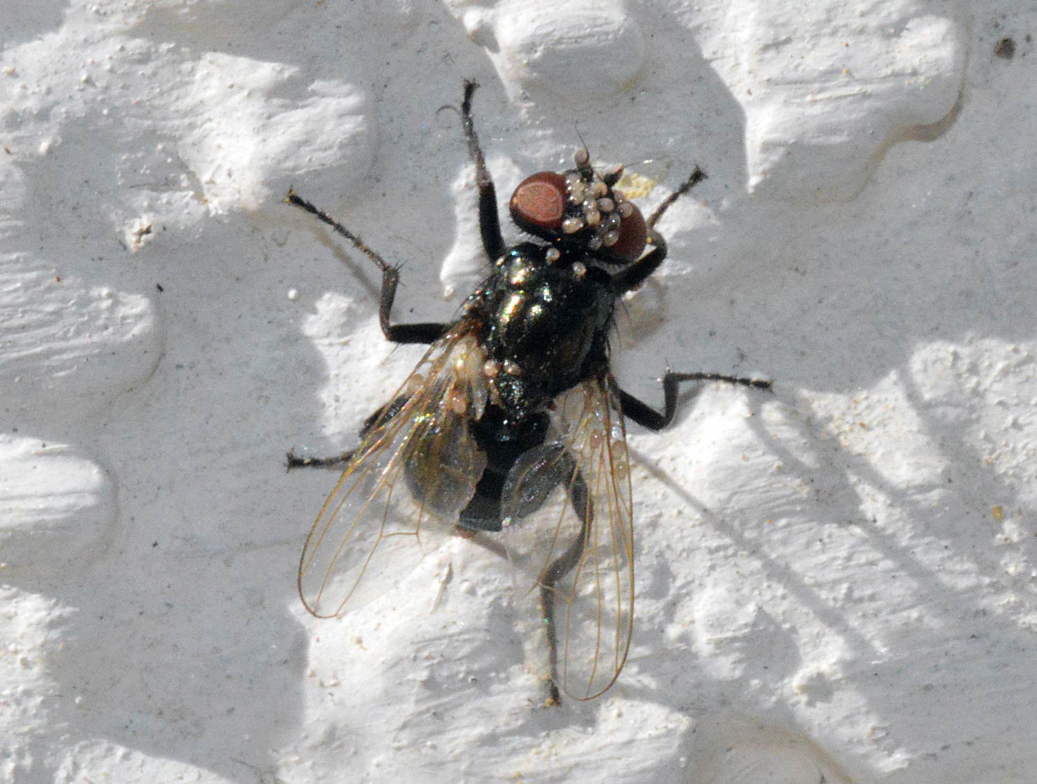 Fig 119. Mosca parasitada por ácaros, desde la cabeza hasta las alas./ C. Pradera 2014