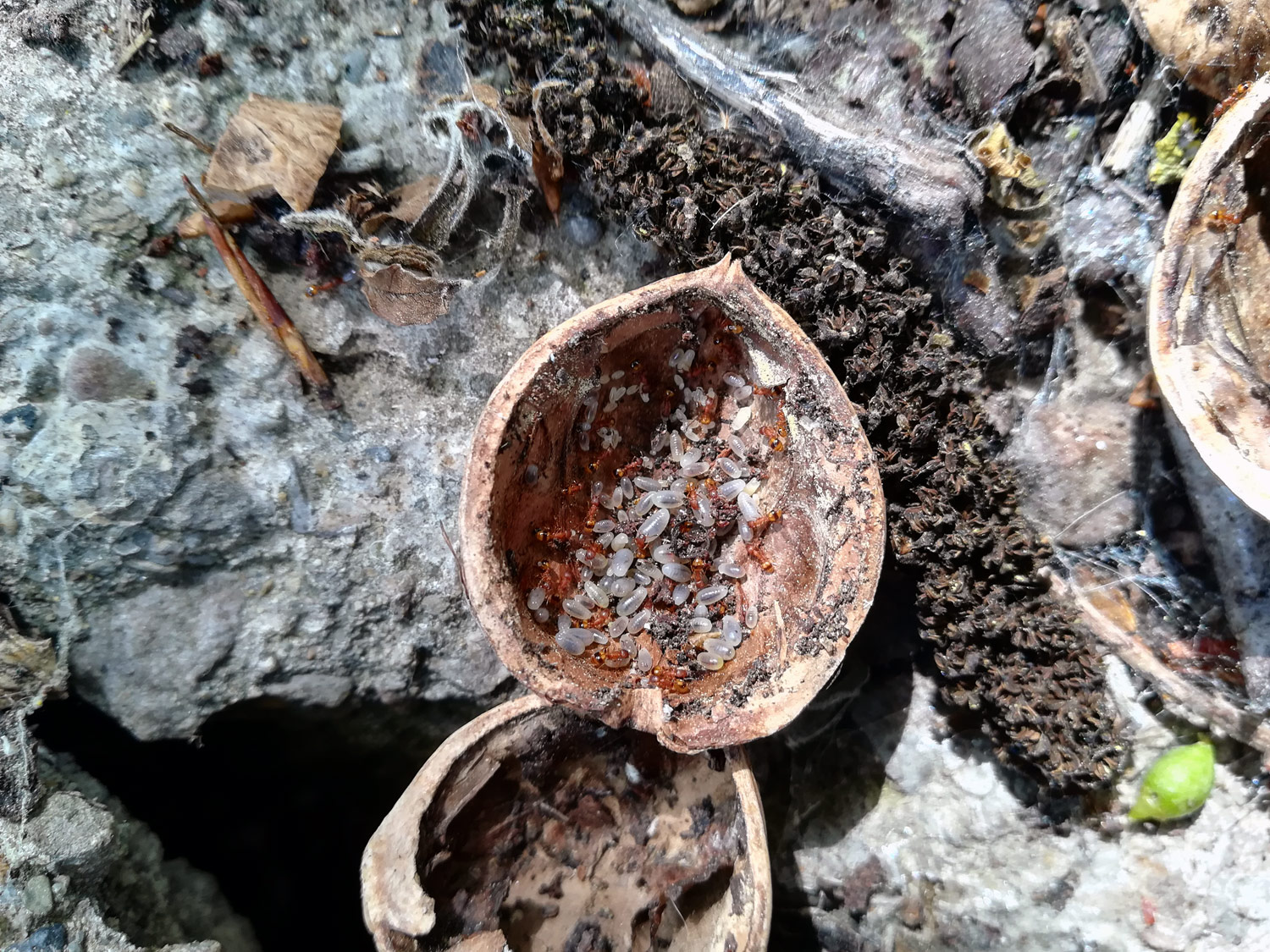 Fig 44. Colonia de hormigas Temnothorax en una nuez./ C. Pradera 05-2019