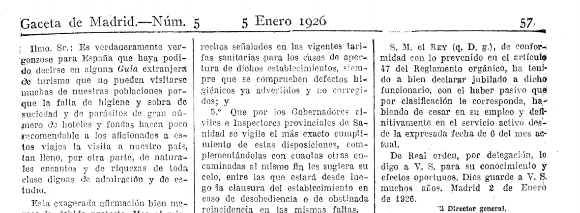 Real orden de 2 de enero de 1926 disponiendo que por los funcionarios de Sanidad correspondiente se giren trimestralmente visitas a los establecimientos que se indican, con el fin de que se encuentren en las debidas condiciones de higiene y salubridad. Ministerio de la Gobernación. Gaceta de Madrid, núm. 5, de 5 de enero de 1926, página 57. Enlace: boe.es/datos/pdfs/BOE/1926/005/A00057-00057.pdf