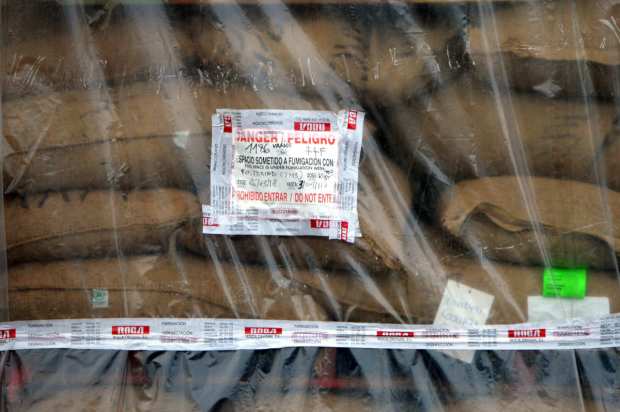 Fig 12. Fumigación con fosfina de una estiba de cacao en Zona Franca de Barcelona./ C. Pradera 2018