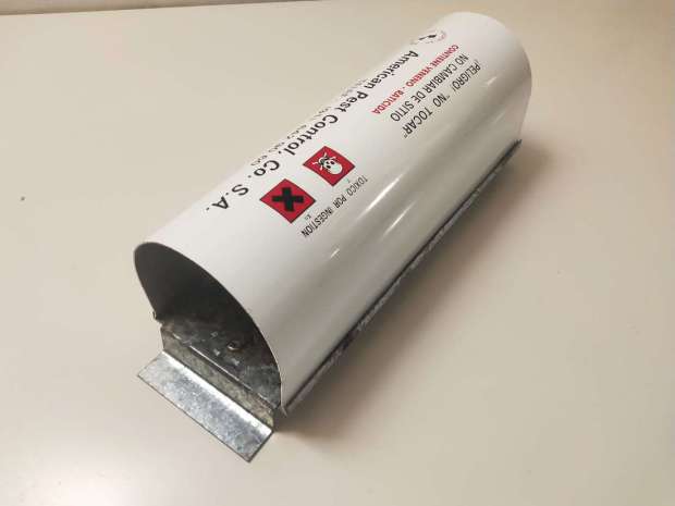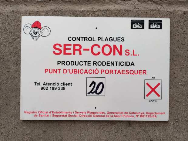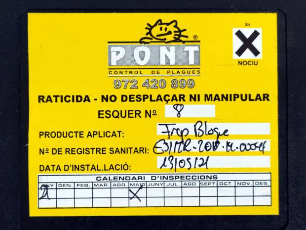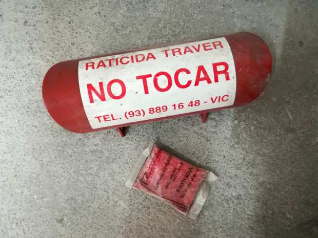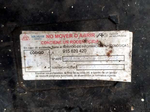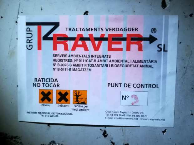 Fig 76. Portacebos y raticida antiguo de Tractaments Verdaguer (TRAVER) en Vic./ C. Pradera 02-2019