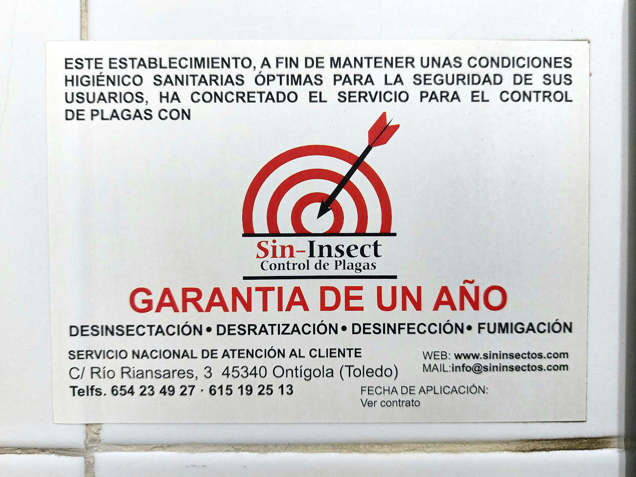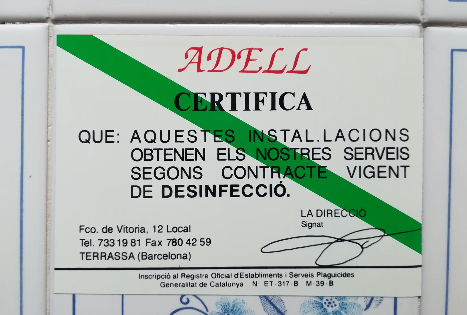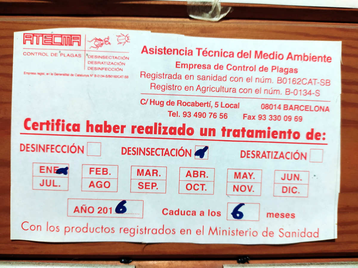 Fig 36. Certificado de pared de Fumigadora Internacional, Tenerife./ C. Pradera 07-2021