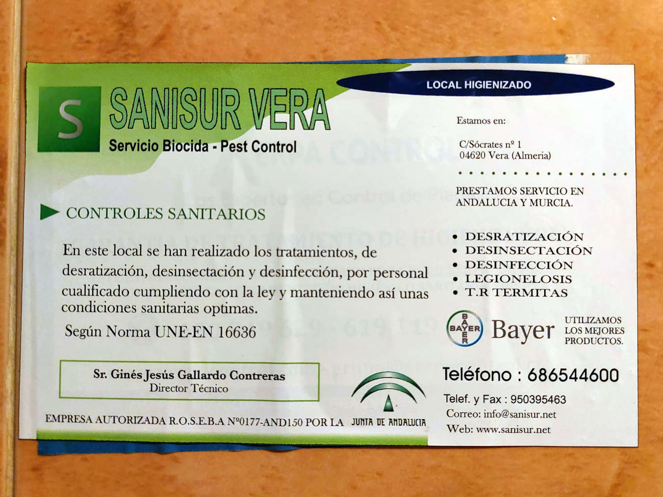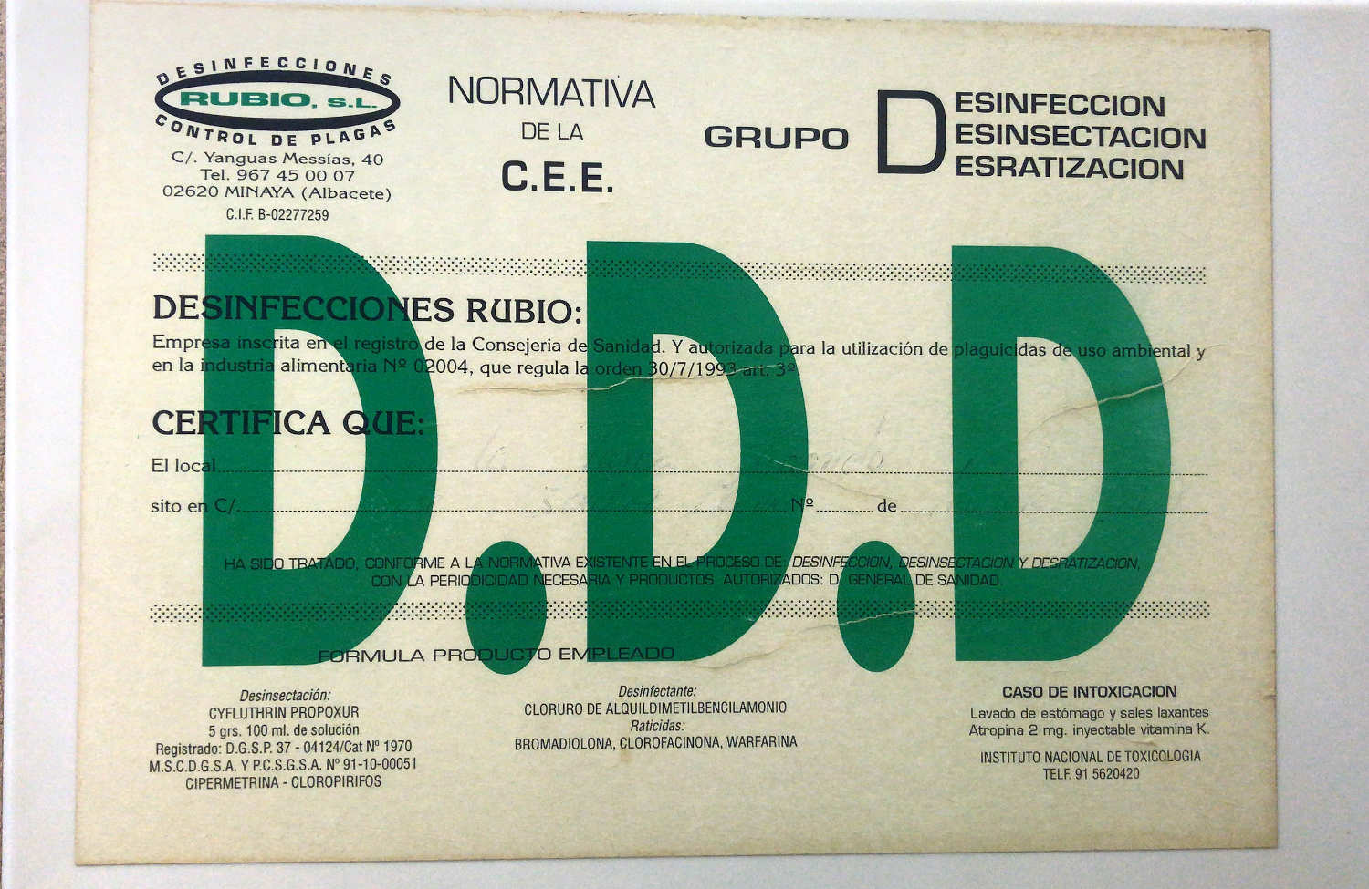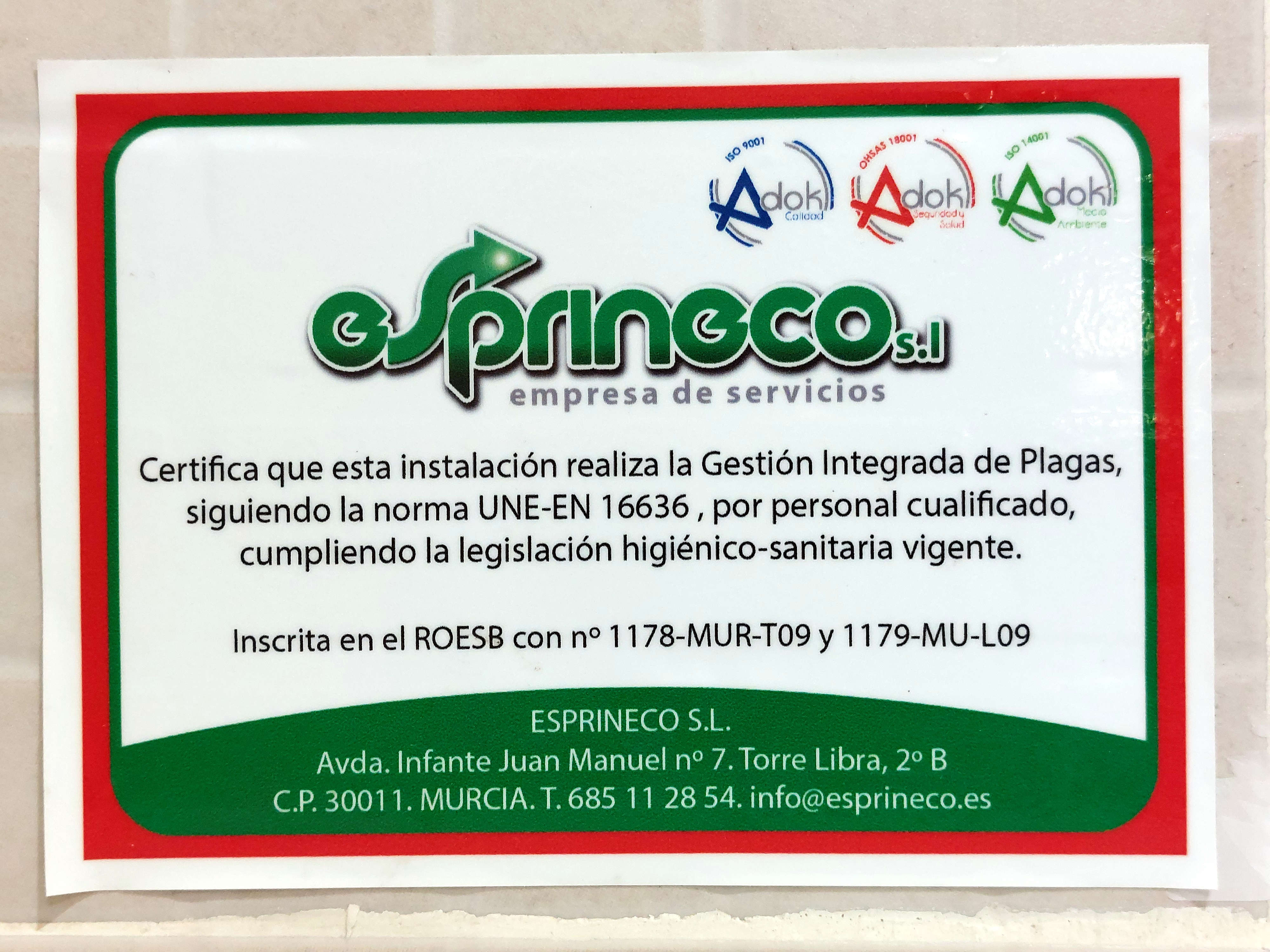 Fig 16. Certificado de pared de Desinfecciones Rubio SL, Albacete./ C. Jordi Ruiz 05-2018