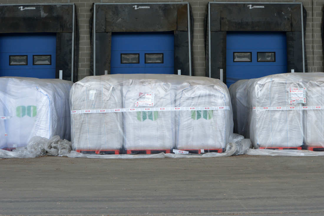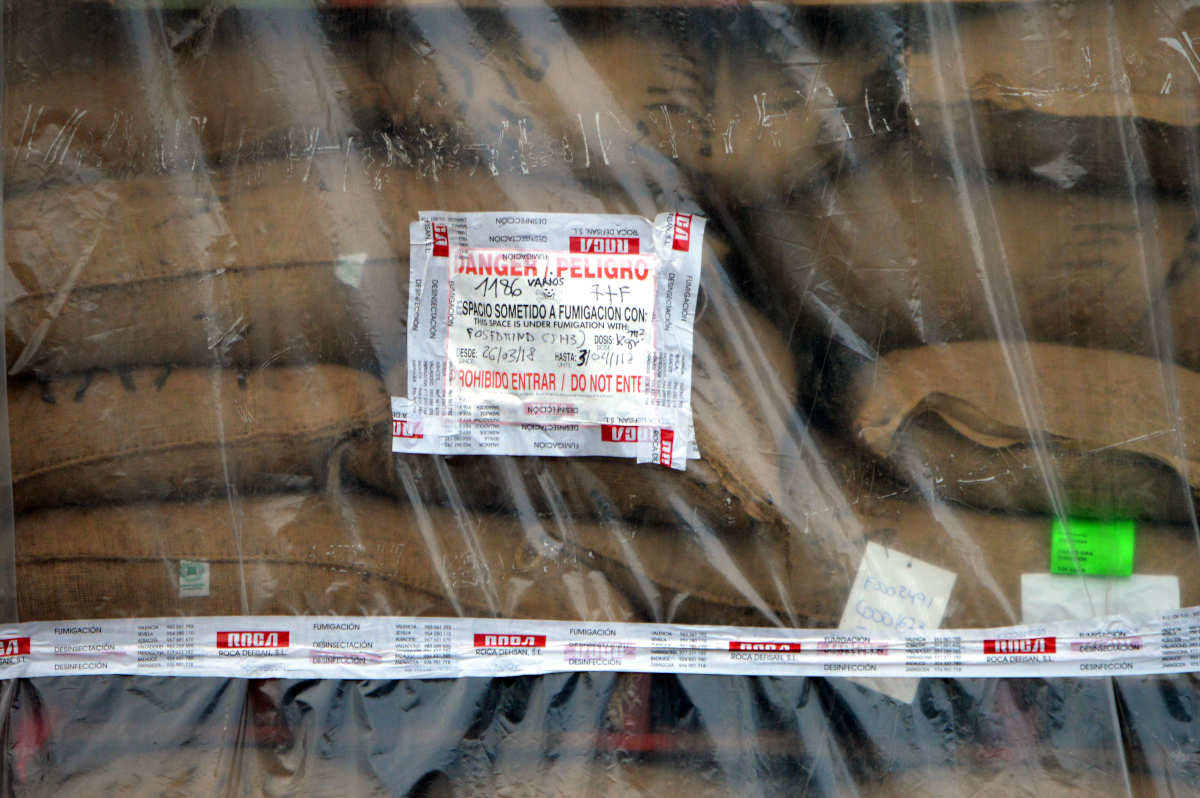 Fig 13. Fumigación con fosfina de una estiba de cacao en Zona Franca de Barcelona./ C. Pradera 2018