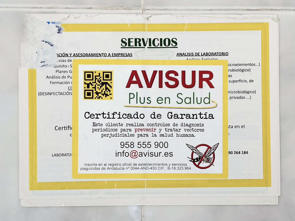 Fig 30. Certificado de pared de Atlantic Plagas, Tenerife./ C. Pradera 07-2021